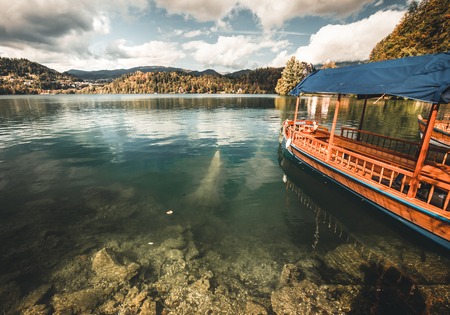 Typical wooden boats, in Slovenian call Pletna , in the Lake Bled, the most famous lake in Slovenia with the island of the church (Europe - Slovenia)