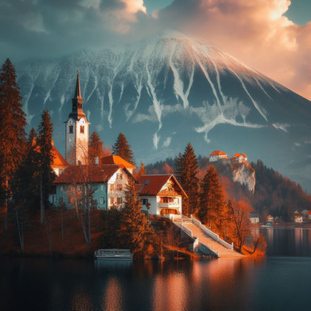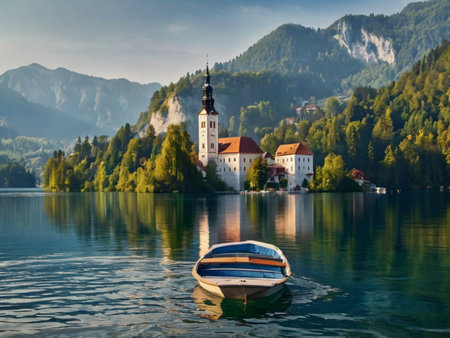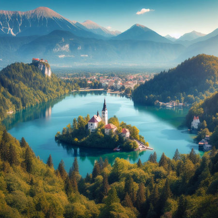 Discover the breathtaking beauty of Lake Bled with its serene waters reflecting a charming island church, embraced by majestic mountain ranges.