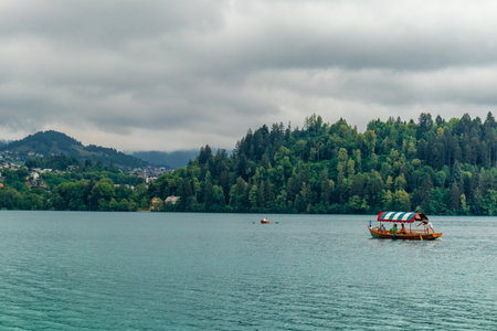 Traditional Pletna boat on the lake. In the background is the famous old church