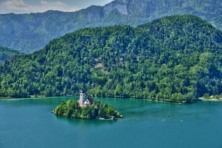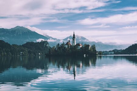 Lake Bled in Slovenia. Beautiful mountains and Bled lake with small Pilgrimage Church. Bled lake and island with Pilgrimage Church of the Assumption of Maria. Bled, Slovenia, Europe.