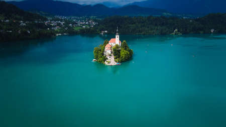 Amazing view on Bled Lake with church dedicated to the Assumption of Mary on a small island, Julian Alps, Slovenia