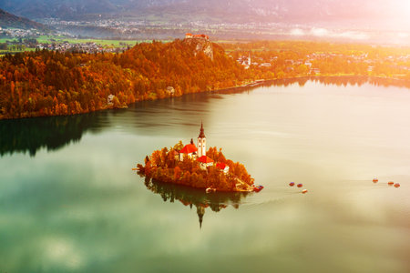 Aerial view of the colorful forest and Lake Bled with a small island with a church. Sunrise in Slovenia in the fall.
