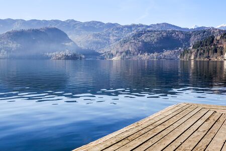 Wooden pier on the Bled lake in Slovenia with famous island and castle on background