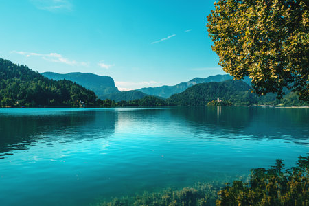 Scenic view of Lake Bled framed by tree branches with the Assumption of Maria Church in the distance. Selective focus.
