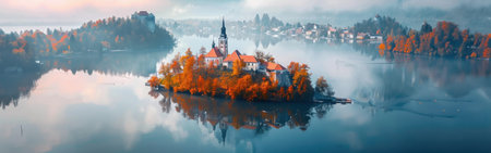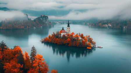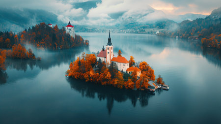 An aerial view of Lake Bled, Slovenia, shows a small island with a church and surrounding trees with autumnal foliage. The lake is calm and reflective, reflecting the surrounding trees and buildings. The morning mist adds a dreamy quality to the scene.