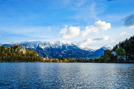 View of Bled Lake during Autumn with Bled Castle and snow and mountains in background, Bled Lake, Slovenia