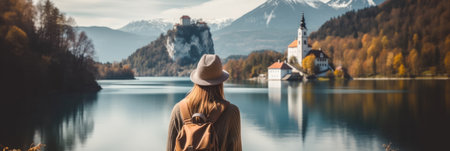 Travel Slovenia, Europe. Woman looking Bled Lake one of most amazing tourist attractions. Sunset winter nature landscape.