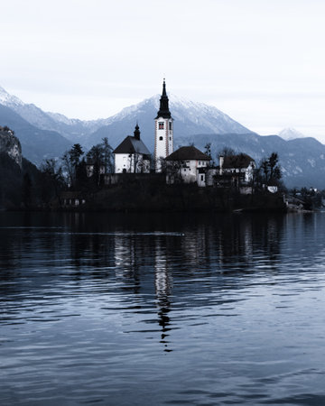 Desaturated Selective blur on the Blejsko ostrvo, or bled island, on Bled lake or Blejsko Jezero, with the assumption of Maria church, or cerkev marijinega vnebovzetja at dusk.