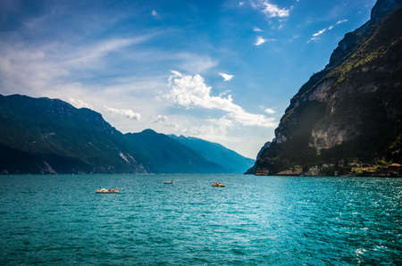 Riva del Garda. mountains beauty and vacation, summer day, travel. Water and lake beauty of nature, relaxion vibe.