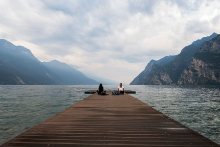 Back view of two women meditating on pier of lake Garda, Italy