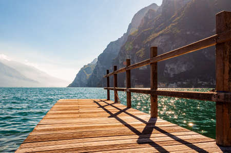 Scenic view on wooden planks pier with railings built on northern shore of beautiful Garda lake in Lombardy, Italy surrounded by high dolomite mountains and crystal clear blue water of the lake.