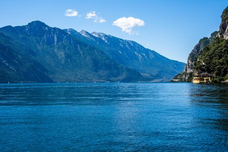 Nature wilderness landscape at lake Garda, Italy on a beautiful summer day. Blue water, rocks, mountains, sunlight and clear sky.