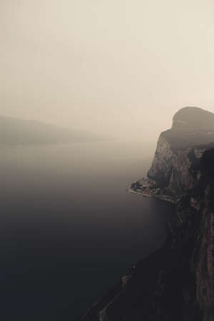 Aerial view of backlit mountains on the shore of the Lake Garda on a hazy day, Italy