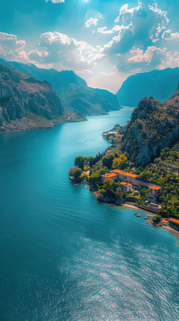The image shows a stunning aerial view of Lake Garda, surrounded by majestic mountains. The water is a deep turquoise blue, reflecting the bright sunshine. The mountains are rugged and green, with a few houses and buildings nestled along the shoreline. The sky is a clear blue, dotted with white clouds. The scene is tranquil and peaceful, showing the beauty of nature.