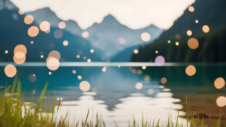 Reflection of mountains in lake with bokeh lights, nature background