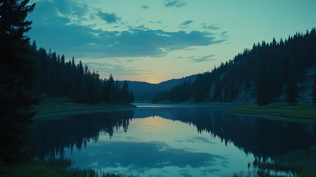 Captivating serene view of a calm lake at twilight, framed by dense evergreen trees and soft clouds, creating a harmonious nature landscape.