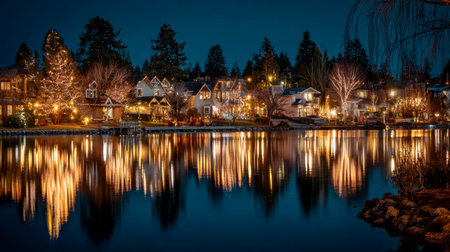 A stunning night scene showcasing a lakefront community adorned with vibrant holiday lights reflecting on the calm water, creating a serene atmosphere.