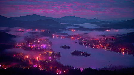 An aerial view presents a tranquil lake scene during twilight. The image showcases a muted color palette dominated by purples and blues. A layer of fog partially obscures the land, while scattered lights sparkle. Suitable for illustrating travel, nature, or environmental themes in commercial projects.