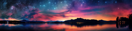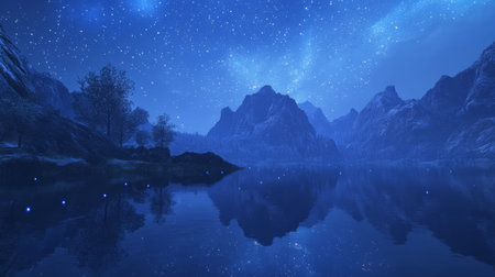 Breathtaking scene capturing a night sky filled with stars and the Milky Way reflecting on a still lake, surrounded by majestic mountains and tranquil nature.