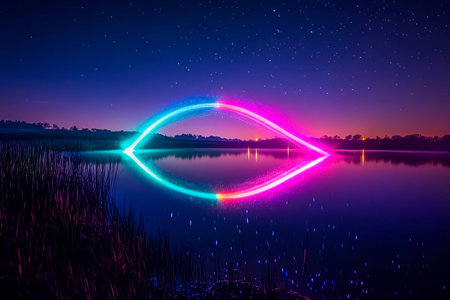 A vibrant light show reflecting off a calm lake.