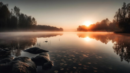 A serene and calm sunrise over a quiet lake created with Generative AI