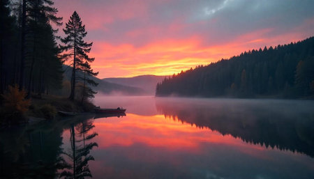 Serene lake reflects vibrant sunrise amidst forested hills