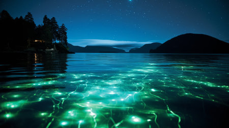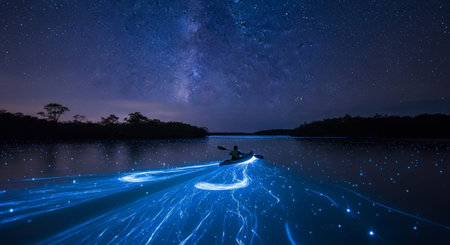 wide-angle view of bioluminescent bay with starry sky, created with generative ai