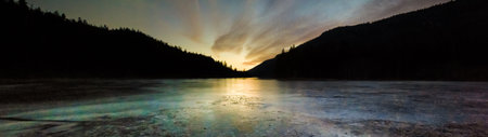 Panoramic view of a frozen lake in the forest at sunset