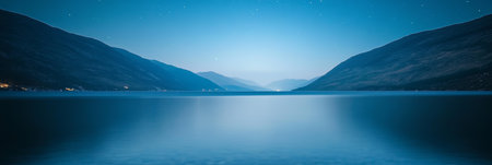 Serene blue night sky, stars reflected in lake, mountains behind, calm design.