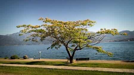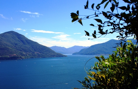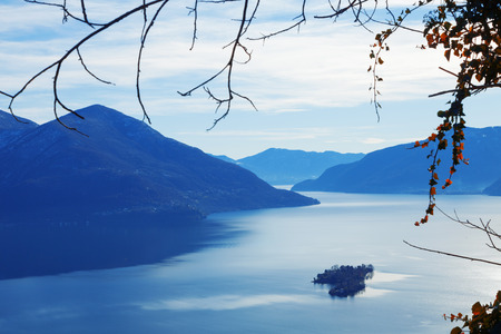 Alpine lake Maggiore with mountains in Locarno, Ticino Canton, just across the international border between Switzerland and Italy (Piedmont region, Province of Verbano Cusio Ossola)