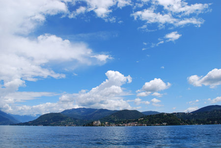 Panoramic view of Orta lake in summer with Alps mountains in background, Piedmont, Italy