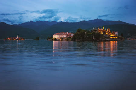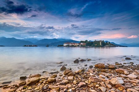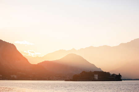Islands and buildings in evening. Sky, mountains and water. Visit Isola Bella in summer.