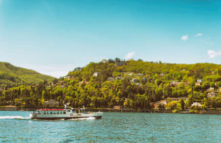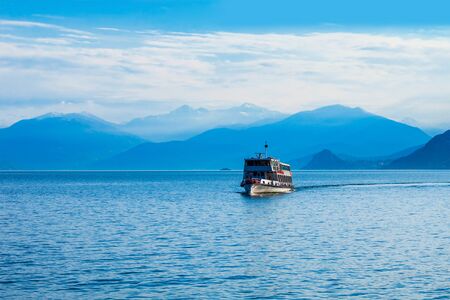 Ferry on lake Como, Northern Italy. The boat is moving on the lake against the background of the Alpine mountains. Tourist destination-Northern Italy.