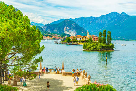 ISOLA BELLA, ITALY, JULY 27, 2017: Tourists are enjoying view on Isola Superiore dei pescatori from Isola Bella at Lago Maggiore, Italy