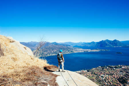 mountaineer as he climbs mountain, along a via ferrata in the autumn