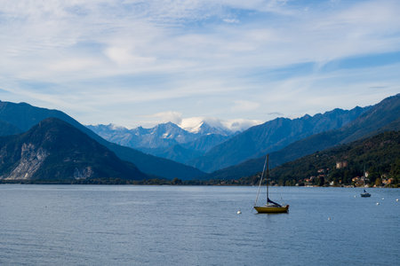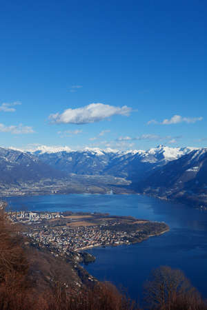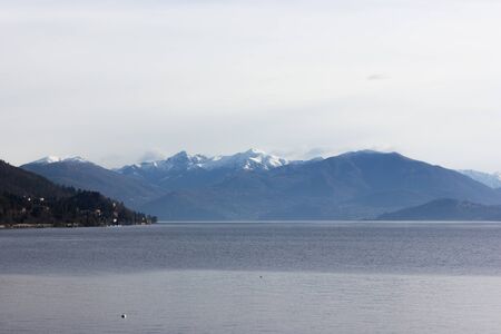 View over Lake Maggiore and Swiss Alps mountains from Italian side in Northern Italy.