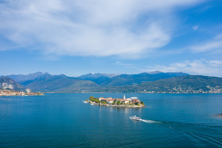 Wide aerial perspective of Isola dei Pescatori surrounded by deep blue water, with a boat crossing Lake Maggiore. Alpine mountains and lakeside villages form a scenic backdrop under a clear sky in northern Italy.