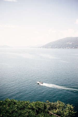 Panoramic view of boat and island in Northern Italy lakes area