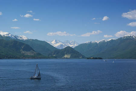 Sail boat in lake Maggiore (northern Italy) with snowy Alps at the horizon