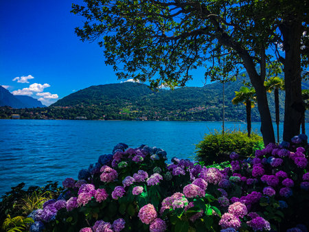 Fantastic views of Lake Como with purple and pink hydrangeas on a sunny summer day