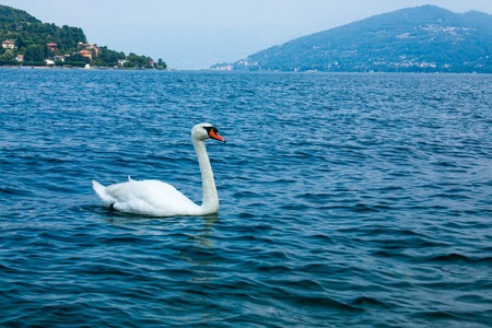 pair of swans swimming peacefully along the river, Lago Maggiore, Italy
