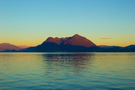 Water, sky and mountains. Landscape during sunset. Trip to Maggiore lake.
