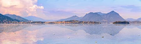 View of Lago Maggiore, Stresa Italy, Europe. Isola Superiore o dei Pescatori. Isola Bella. Viewpoint. Evening on Borromean Islands. Switzerland at twilight. Laveno Mombello town. North of Italy.