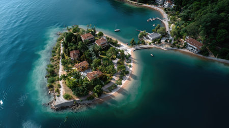 A stunning aerial view captures a tranquil island retreat featuring luxurious villas surrounded by crystal-clear waters and lush greenery, perfect for relaxation.
