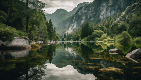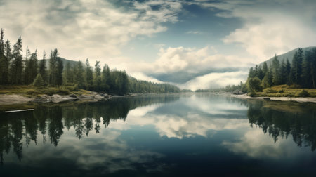 A tranquil lake reflecting the lush green forests and cloudy skies. This serene landscape captures the beauty of nature, perfect for relaxation and outdoor themes.