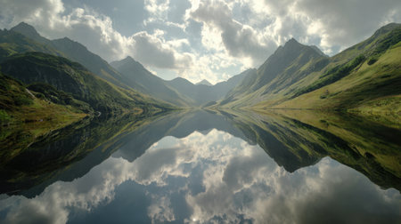 Panoramic view of a mountain lake with clouds reflected in the water