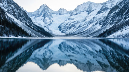 This image showcases towering, snow-covered mountains reflected in the still surface of a lake. The scene is dominated by shades of blue and white, with a tranquil atmosphere. The composition emphasizes symmetry and balance. This visual can be utilized for various commercial projects and editorial uses related to nature.