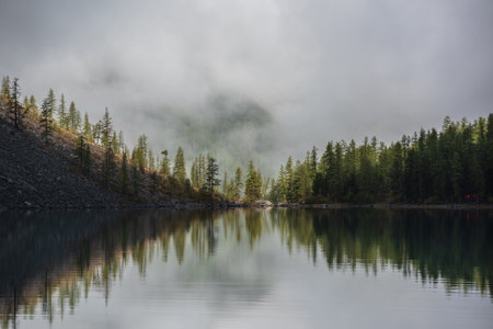 Tranquil meditative scenery of glacial lake with pointy fir tops reflection and forest hill in thick low clouds. Graphic EQ of spruce tops on alpine lake in dense fog. Mountain lake at early morning.