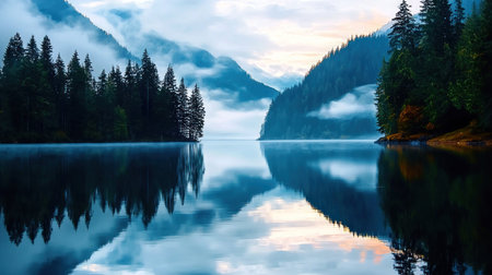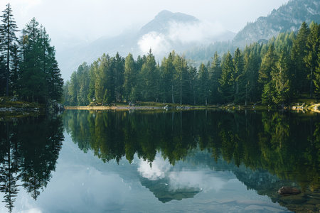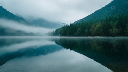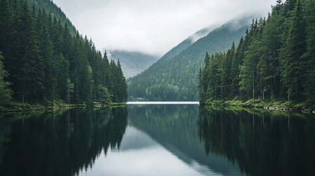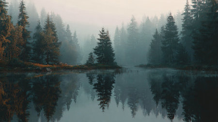 Discover the tranquil beauty of a serene forest lake, surrounded by towering evergreen trees and enveloped in mysterious fog. This peaceful scene invites reflection and relaxation in a captivating natural environment rich in greenery and calm waters.