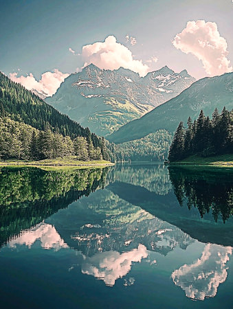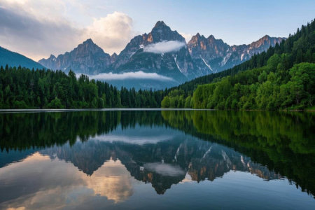 Breathtaking mountain landscape featuring a serene lake reflecting the stunning peaks and lush greenery. Ideal for nature and travel themes.